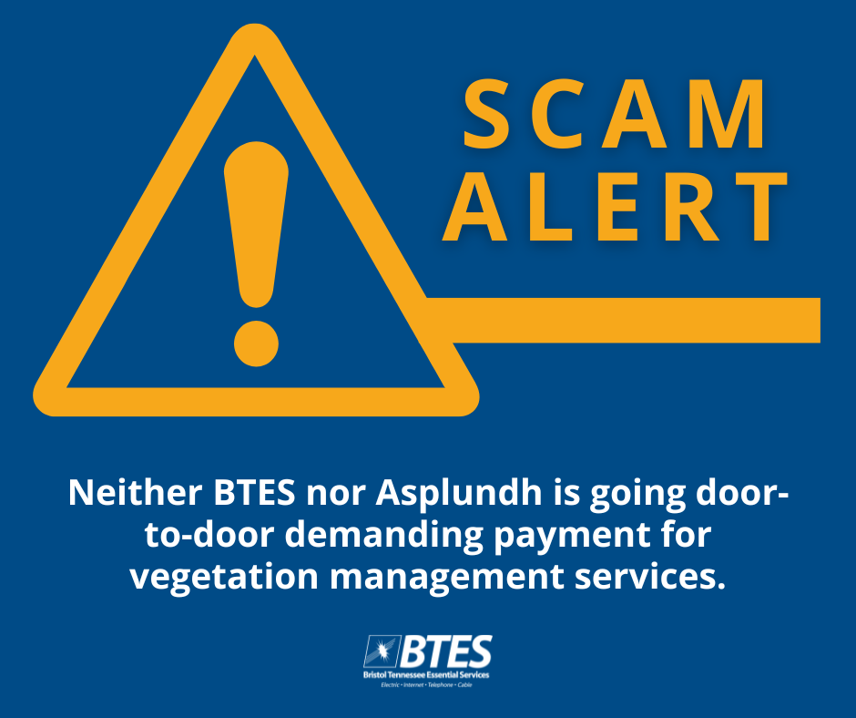 SCAM ALERT – We have been notified that someone is going door-to-door attempting to collect money from our customers after our tree trimming crews have been in their area. The scammer is saying that they are there to collect the payment for the trees that our Asplundh crews trimmed or removed from their property. THIS IS A SCAM. Neither BTES nor Asplundh will request money for tree trimming and vegetation management projects. If you are approached with this scam, please contact your local authorities.