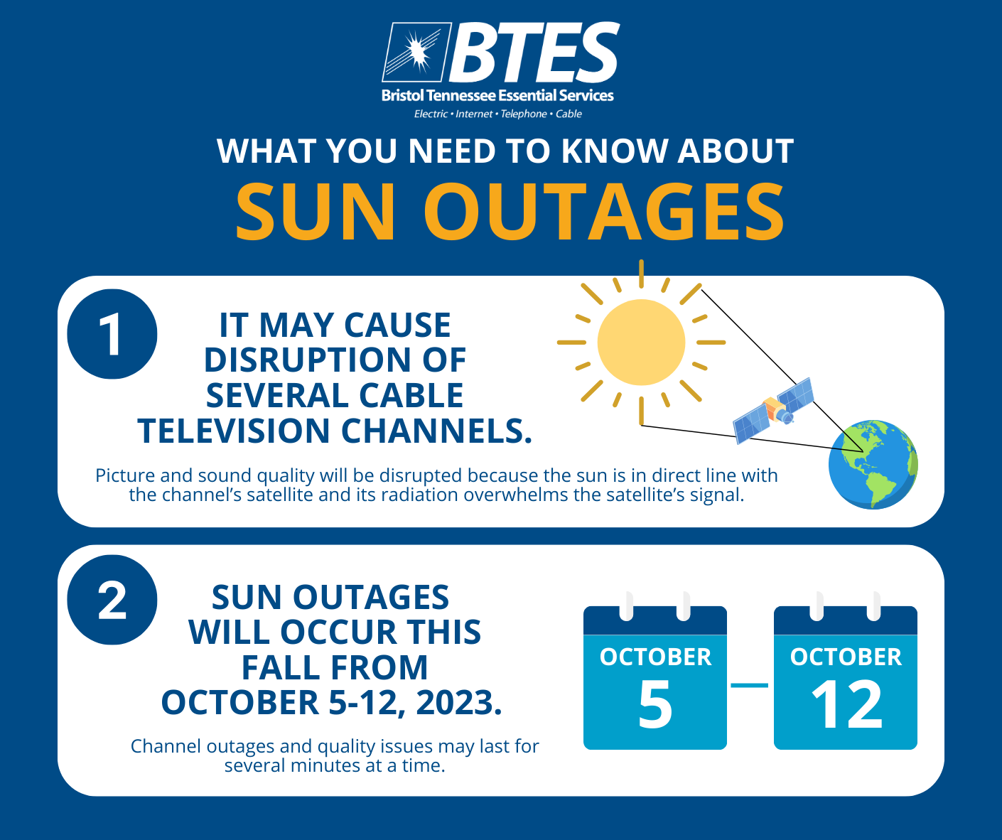 Sun outages occur every year in the Fall and Spring, and last about a week each time. This Fall, sun outages are expected between October 5-12, 2023. The exact time will vary from channel to channel and may last for several minutes.